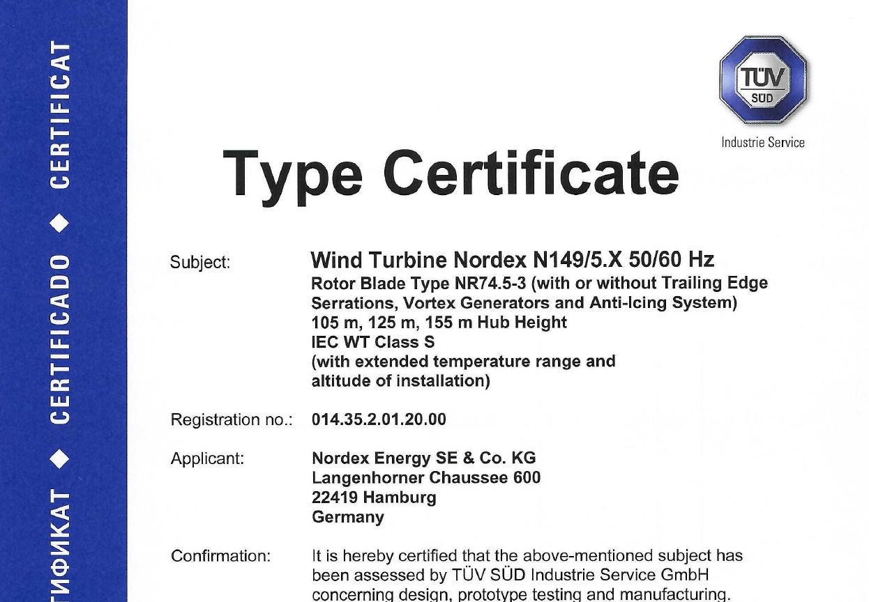 Nordex Group receives IEC type certification for N149/5.X turbine from TÜV SÜD