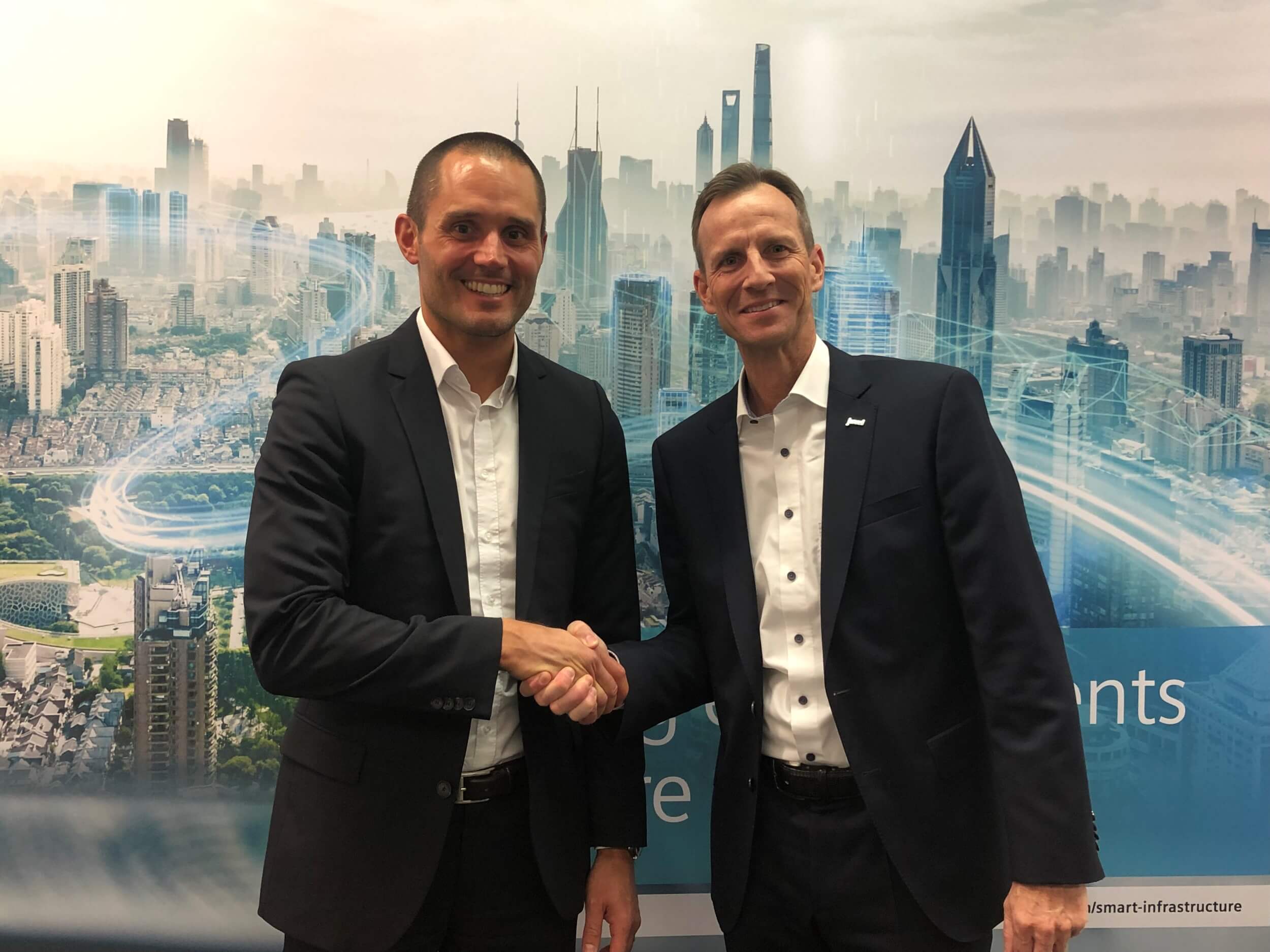 BU: Robert Klaffus (links), CEO Digital Grid bei Siemens Smart Infrastructure, Stephan Hansen, Mitglied des Vorstands und COO der juwi-Gruppe, vereinbarten heute eine strategische Partnerschaft beider Unternehmen für Microgrids für die Bergbauindustrie