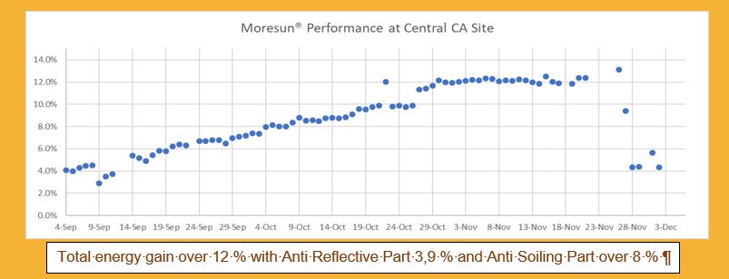 The improved energy production achieved from the MoreSun anti-reflection coating is able to offset natural degradation that occurs in all PV technologies. “The combination of increased energy generation from the AR coating plus improvements from anti-soiling can result in payback in as little as 2-3 years,” explained Mr. Fuss