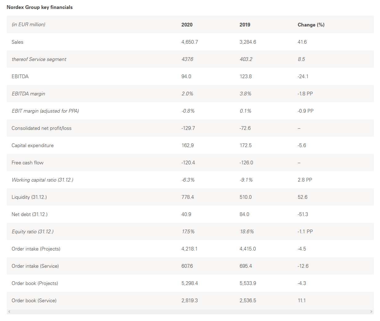 The Nordex Group today published its annual financial statements and has thus confirmed the preliminary results, including guidance, published on 5 March 2021. Consolidated sales increased sharply by 41.6 percent to EUR 4,650.7 million (2019: EUR 3,284.6 million). At 2.0 percent, the Company's EBITDA margin reached the expected level but was well below the previous year’s figure (2019: 3.8 percent). The working capital ratio in relation to consolidated sales was minus 6.3 percent at the end of the year, significantly lower than the target level of below minus 4 percent (2019: minus 9.1 percent). Capital expenditure declined year-on-year to EUR 162.9 million (2019: EUR 172.5 million), just short of the expected figure of EUR 170.0 million. Free cash flow amounted to EUR -120.4 million (2019: EUR -126.0 million).