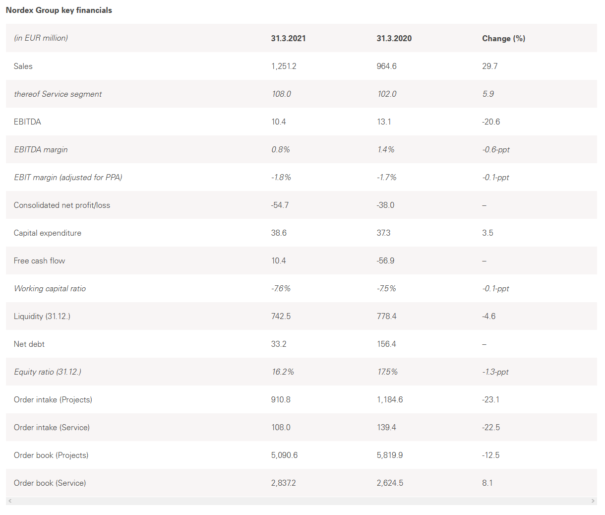 © Nordex SEHamburg (renewablepress) - The Nordex Group (ISIN: DE000A0D6554) today reported results for the first quarter of 2021. Sales increased from EUR 964.6 million in the previous year's quarter to EUR 1,251.2 million in the first quarter of 2021. Earnings before interest, taxes, depreciation and amortization (EBITDA) came to EUR 10.4 million, slightly down compared to the previous year's level of EUR 13.1 million. This results in an EBITDA margin of 0.8 percent (Q1/2020: 1.4 percent). The increase in revenues is due in particular to the significant rise in installations. By contrast, the EBITDA margin contracted compared to the previous year’s quarter, which had not been affected by the COVID-19 pandemic. As a result of the measures taken by Nordex, business processes are largely stable, although their efficiency is still impacted or they are delayed. In addition, a large number of lower margin legacy projects was still being executed in the first quarter of 2021.