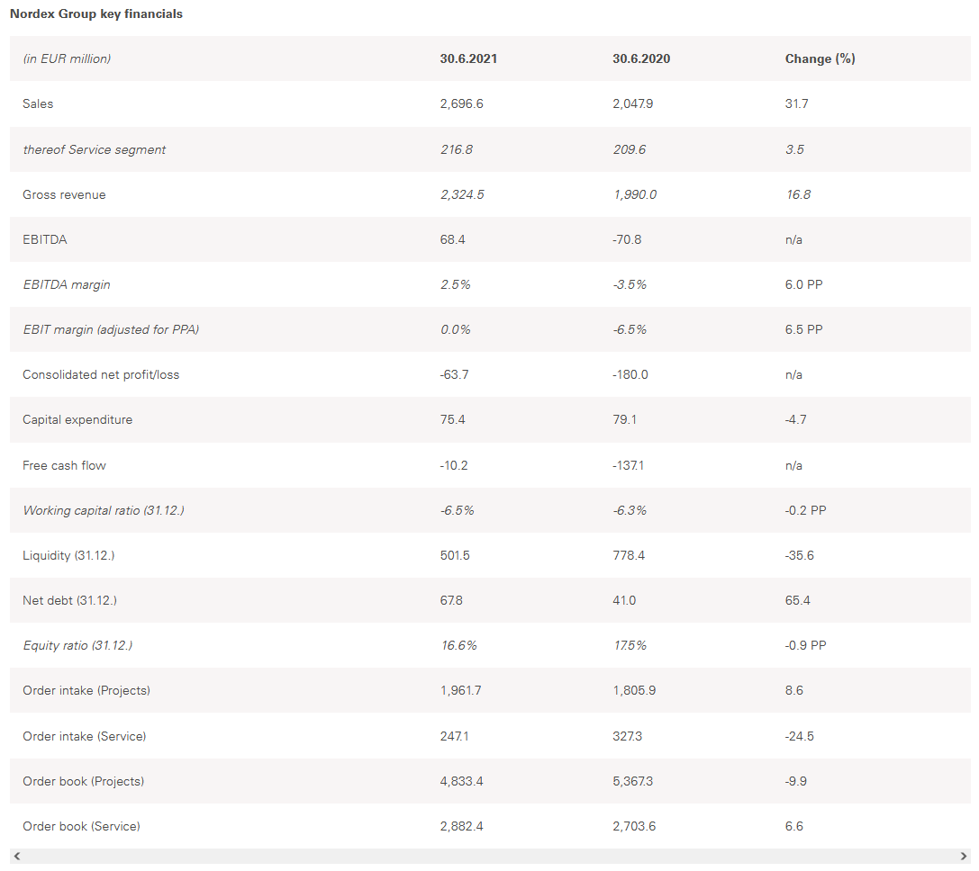 © Nordex SEHamburg (renewablepress) - The Nordex Group (ISIN: DE000A0D6554) announced today significant year-on-year growth in sales and earnings before interest, taxes, depreciation and amortization (EBITDA) in the first half of 2021. Sales rose to EUR 2.7 billion (H1 2020: EUR 2.0 billion) due to the sharp increase in activity levels. Gross revenue, which also includes changes in inventories, rose by almost 17 percent to EUR 2,324.5 million (H1 2020: EUR 1,990.0 million). The impact of the COVID-19 pandemic on the operating business only had a limited influence on the Group’s positive performance in the second quarter. However, the indirect effects of the pandemic were still clearly evident in the upheaval in the raw materials and logistics markets. Against this backdrop, EBITDA amounted to EUR 68.4 million (H1 2020: EUR -70.8 million). This corresponds to an EBITDA margin of 2.5 percent (H1 2020: -3.5 percent).