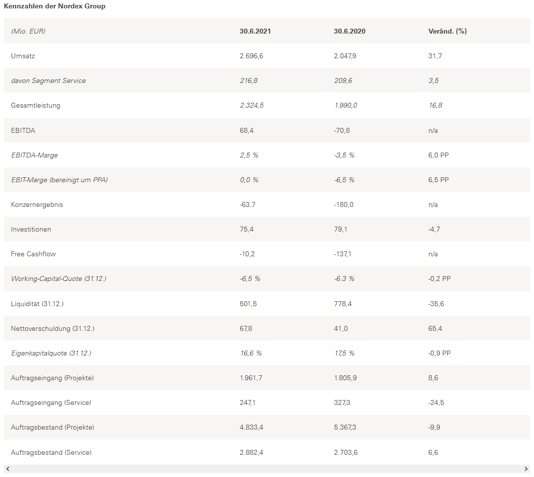 © Nordex SEHamburg (iwr-pressedienst) - Die Nordex Group (ISIN: DE000A0D6554) hat im ersten Halbjahr 2021 einen deutlichen Anstieg von Umsatz und Ergebnis vor Zinsen, Steuern und Abschreibungen (EBITDA) gegenüber dem Vorjahreszeitraum verzeichnet. Der Umsatz stieg als Folge des deutlich erhöhten Aktivitätsniveaus auf EUR 2,7 Mrd. (H1/2020: EUR 2,0 Mrd.). Die Gesamtleistung, die auch Bestandsveränderungen umfasst, erhöhte sich um nahezu 17 Prozent auf EUR 2.324,5 Mio. (H1/2020: EUR 1.990,0 Mio.). Die positive Entwicklung wurde im zweiten Quartal nur noch in geringem Umfang durch die Auswirkungen der COVID-19-Pandemie auf das operative Geschäft beeinflusst. Dahingegen waren die indirekten Auswirkungen der Pandemie durch Verwerfungen an den Rohstoff- und Logistikmärkten noch deutlich sichtbar. Vor diesem Hintergrund belief sich das EBITDA auf EUR 68,4 Mio. (H1/2020: EUR -70,8 Mio.). Dies entspricht einer EBITDA-Marge von 2,5 Prozent (H1/2020: -3,5 Prozent).