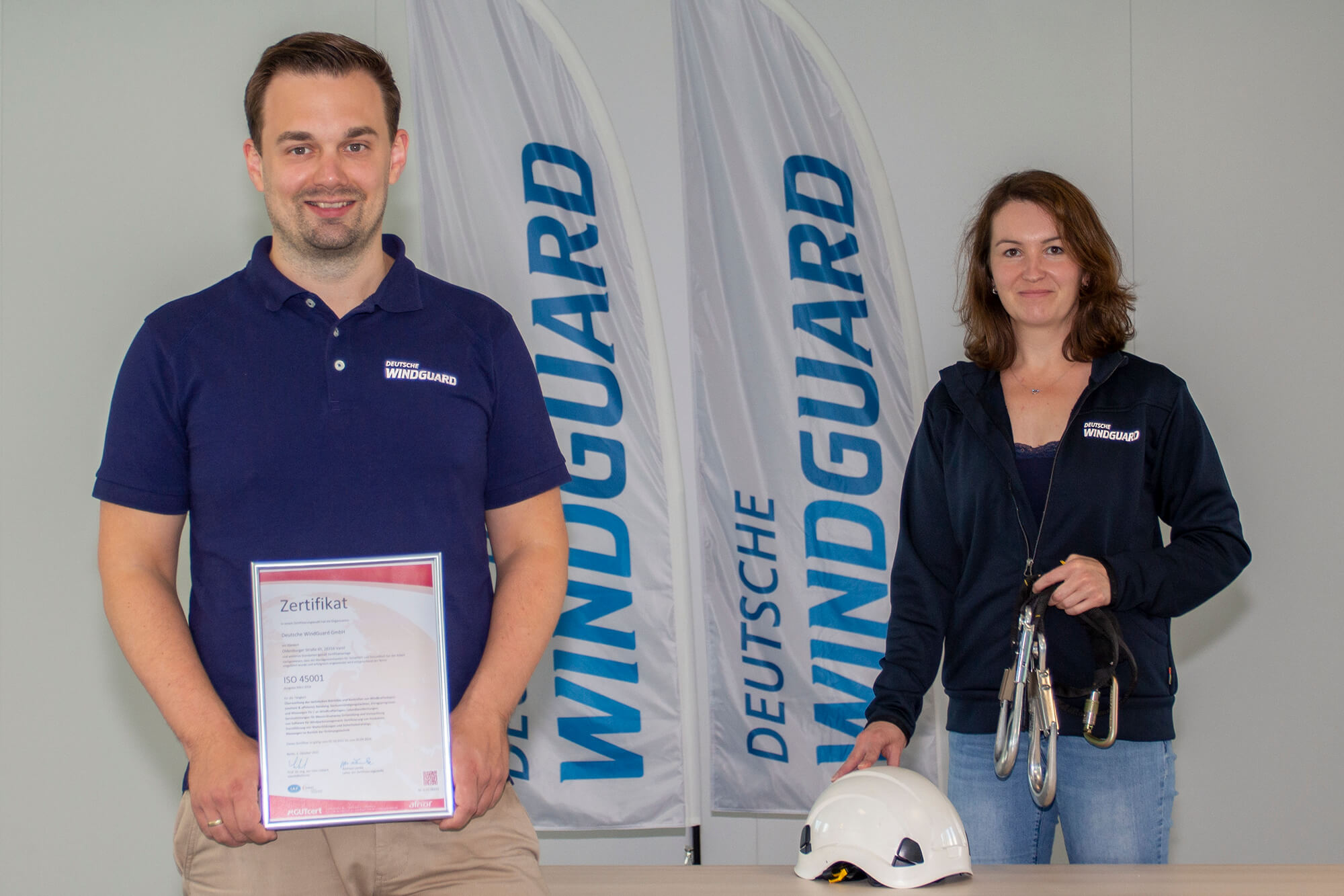 BU: Die Deutsche WindGuard hat ihr Managementsystem für Arbeits- und Gesundheitsschutz erfolgreich nach ISO 45001 zertifizieren lassen. Über das Erreichen dieses wichtigen Meilensteins freuen sich Tobias Künne, Leiter Corporate Governance, und Janina Düpont, Fachkraft für Arbeitssicherheit.