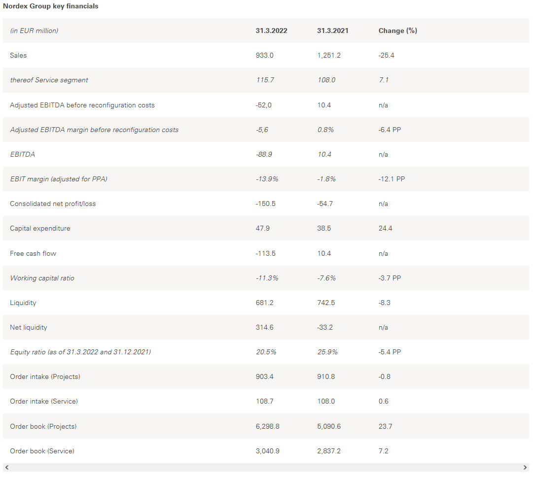 © Nordex SEHamburg (renewablepress) - The Nordex Group (ISIN: DE000A0D6554) today presented its figures for the first quarter of 2022. This announcement has been delayed, as announced on 5 May 2022, because the Nordex Group was exposed to a cyber security incident at the end of March. The Company generated sales of EUR 933 million (Q1/2021: EUR 1,251 million). The trend in sales is attributable to a planned change in production to different blades and weather-related lower installation output.