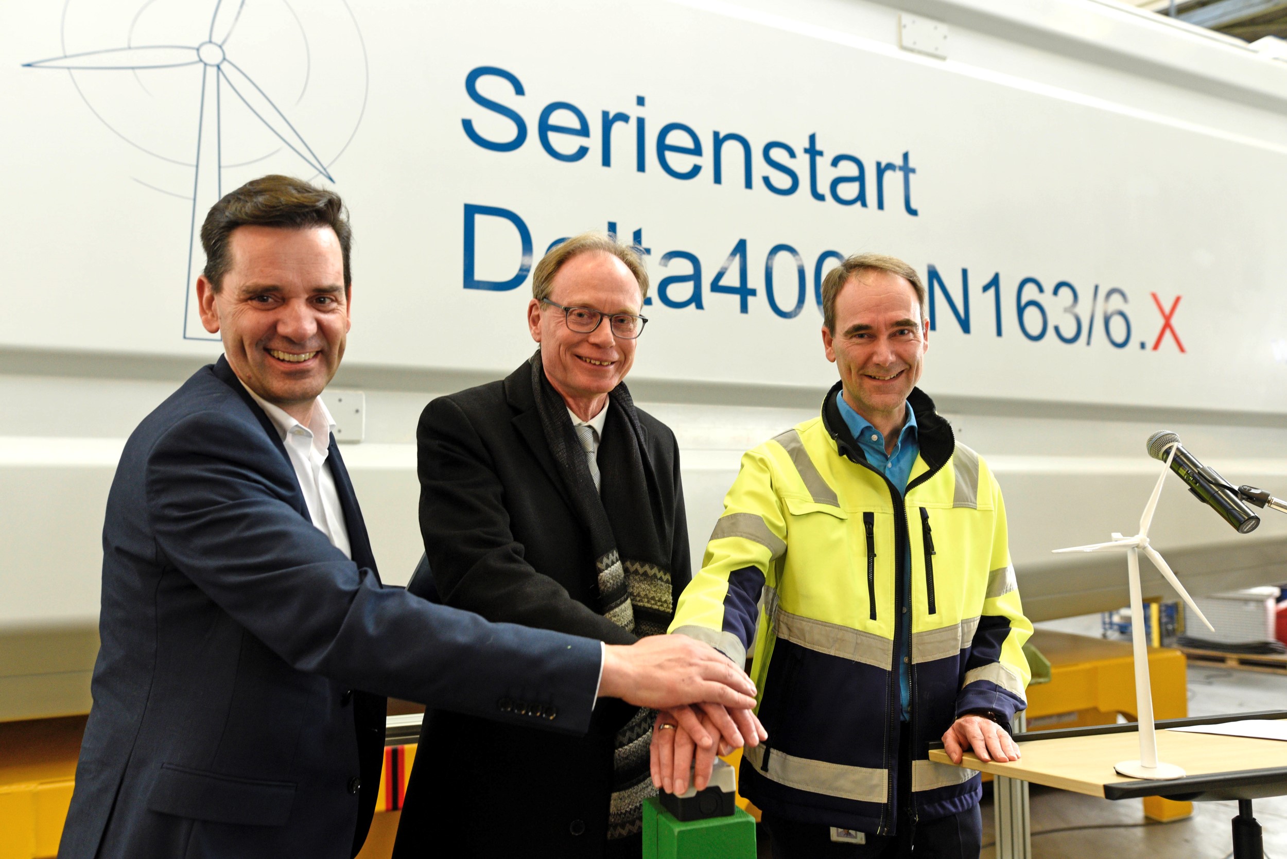 „Nur sieben Monate nach der Errichtung der ersten zwei Prototypen der aktuell leistungsstärksten Großturbinen der Nordex Group, rollen jetzt planmäßig die Anlagen des Typs N163/6.X der 6-MW-Klasse in Serie aus unserem deutschen Produktionswerk. Langfristig soll die Jahresproduktion allein dieser Großturbinen hier ca. 1 GW betragen”, so Blanco anlässlich der Feier zum Serienanlauf.