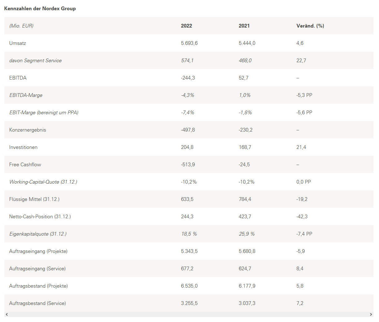 Die Nordex Group hat heute ihren Jahresabschluss 2022 veröffentlicht und damit die am 9. März 2023 veröffentlichten vorläufigen Ergebnisse bestätigt. Der Konzernumsatz ist um 4,6 Prozent auf EUR 5,7 Mrd. gewachsen (2021: EUR 5,4 Mrd.). Das Ergebnis vor Zinsen, Steuern und Abschreibungen (EBITDA) belief sich auf minus EUR 244,3 Mio. (2021: EUR 52,7 Mio.) und entspricht einer Marge von minus 4,3 Prozent (2021: 1,0 Prozent). Damit hat der Umsatz das obere Ende des zuletzt prognostizierten Korridors erreicht, während die EBITDA-Marge nach einem sehr volatilen vierten Quartal wie zuletzt erwartet lag. Die auf den Konzernumsatz bezogene Working-Capital-Quote belief sich zum Jahresende 2022 auf minus 10,2 Prozent. Somit lag sie erneut deutlich unter dem prognostizierten Wert von kleiner minus 7 Prozent (2021: minus 10,2 Prozent). Die Investitionen sind auf EUR 204,8 Mio. gestiegen (2021: EUR 168,7 Mio.) und übertrafen das erwartete Volumen von EUR 180 Mio.