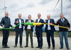 BU: Feierliche Eröffnung des Windparks Volkmarsdorf durch Ulrich Lange, Dr. Hans-Kaspar Scherrer, Lars Hieke, Rüdiger Fricke, Gerhard Radeck und Jörg Bochannek (v.l.n.r.)