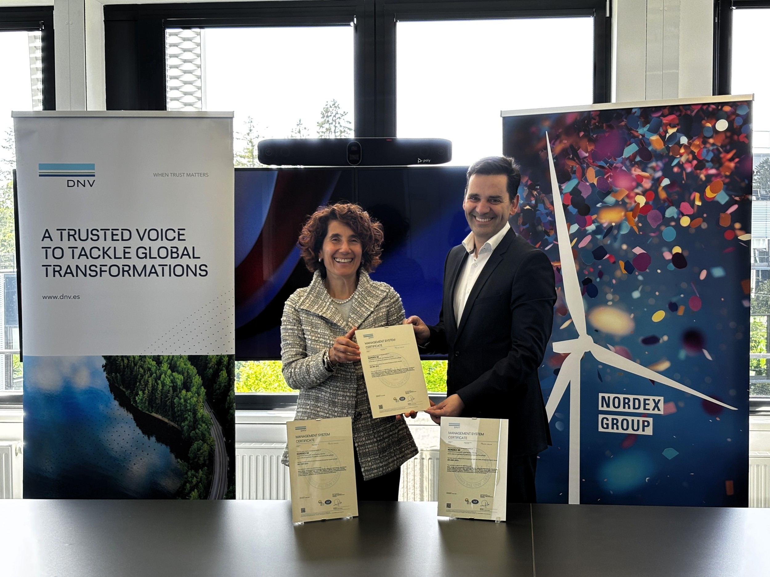 © Nordex SEHamburg (iwr-pressedienst) - Im Rahmen einer feierlichen Zertifikatsübergabe wurde die Nordex Group gestern von DNV mit einheitlichen globalen Zertifizierungen für die folgenden Managementsysteme ausgezeichnet: Qualität (ISO 9001), Arbeitssicherheit und Gesundheitsschutz (ISO 45001) und Umweltmanagement (ISO 14001).